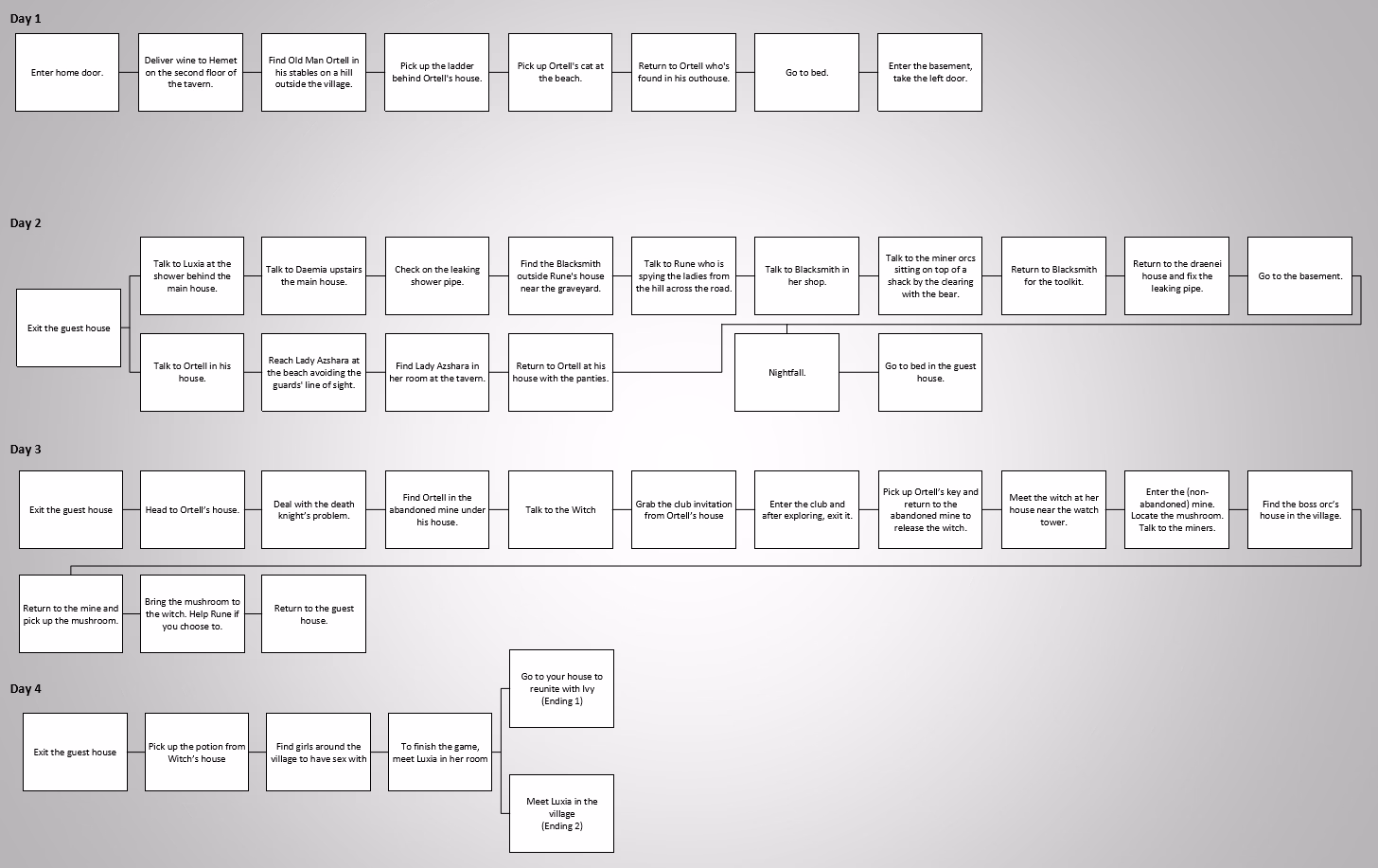 Human male main character returns from failed raid to find his wife having sex with somebody else, and gets kicked out of his house. A plan (of sorts) is concocted to make his dick bigger because he thinks that will magically solve his problems, which requires him to find a (horny and annoying) old man. This sets off a chain of events which has him watching and participating in many sex acts, mostly involving female Draenei.